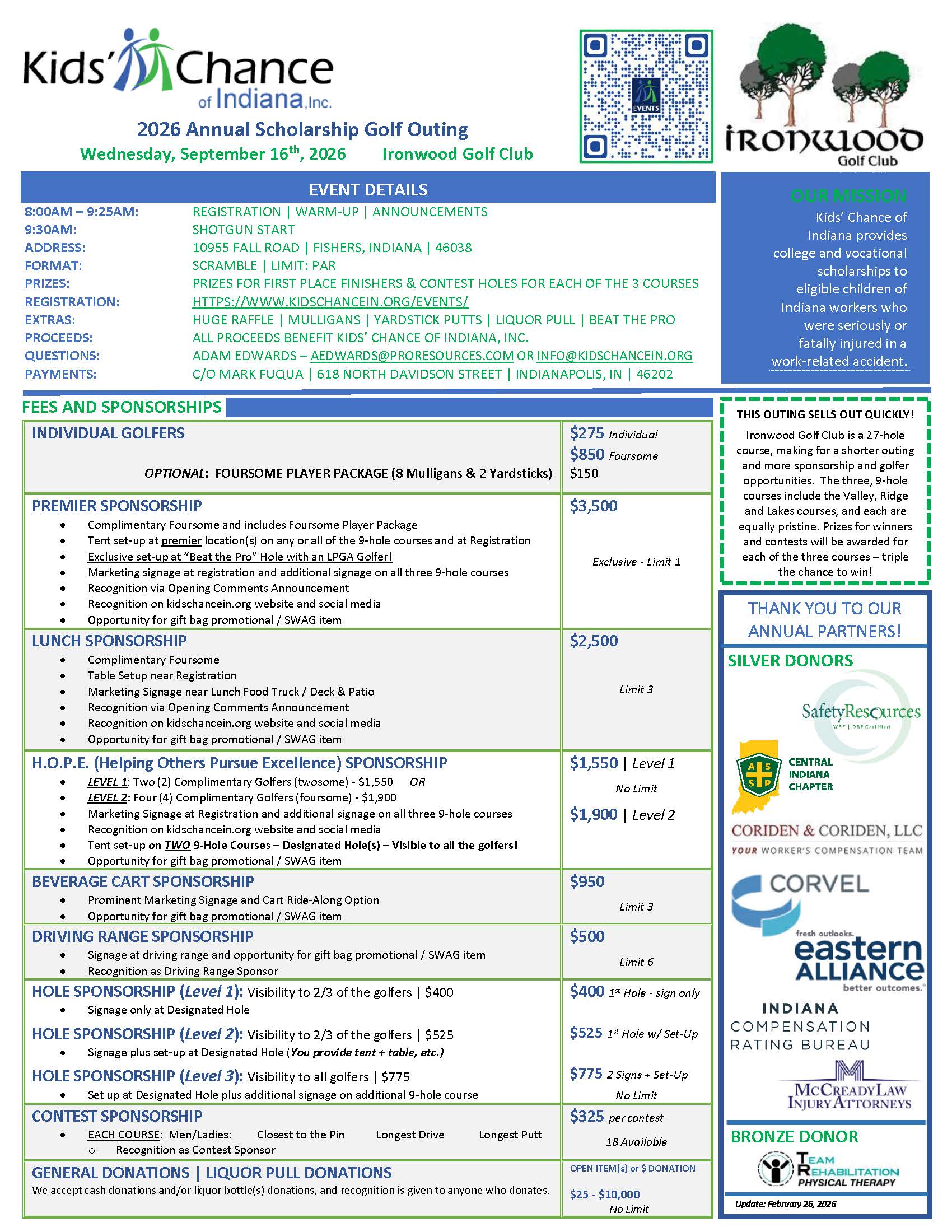 Events are essential to fundraising for Kids’ Chance of Indiana. Through our events, we receive donations and spread the word about our growing organization. Check out our upcoming events below.